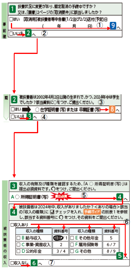 ⑧被扶養者の2024年中の収入をすべて合計し、手続ガイド 別表3 の「年収」範囲内であれば、□はい にチェックを入れ(☑)、右の選択項目も併せて該当するものにチェックを入れ(☑)てください。6 へ進みます。