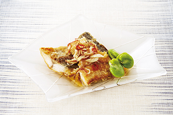 - フライパンに油を熱し④のアジを入れて両面色よく焼いて火を通し、熱いうちに②に入れて15分くらい漬ける。途中でアジを裏返す。