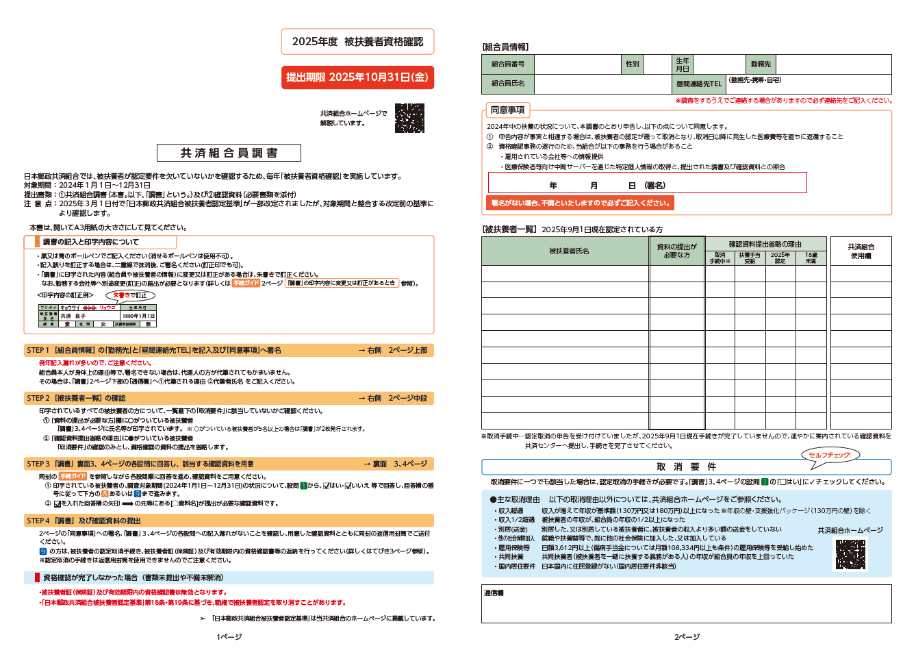 提出期限の2025年10月31日より前に資格を喪失(任意継続組合員脱退を含む)される方は、共済組合員調書に署名し、通信欄へ退職年月日を記入の上、共済組合員調書のみ返送してください。