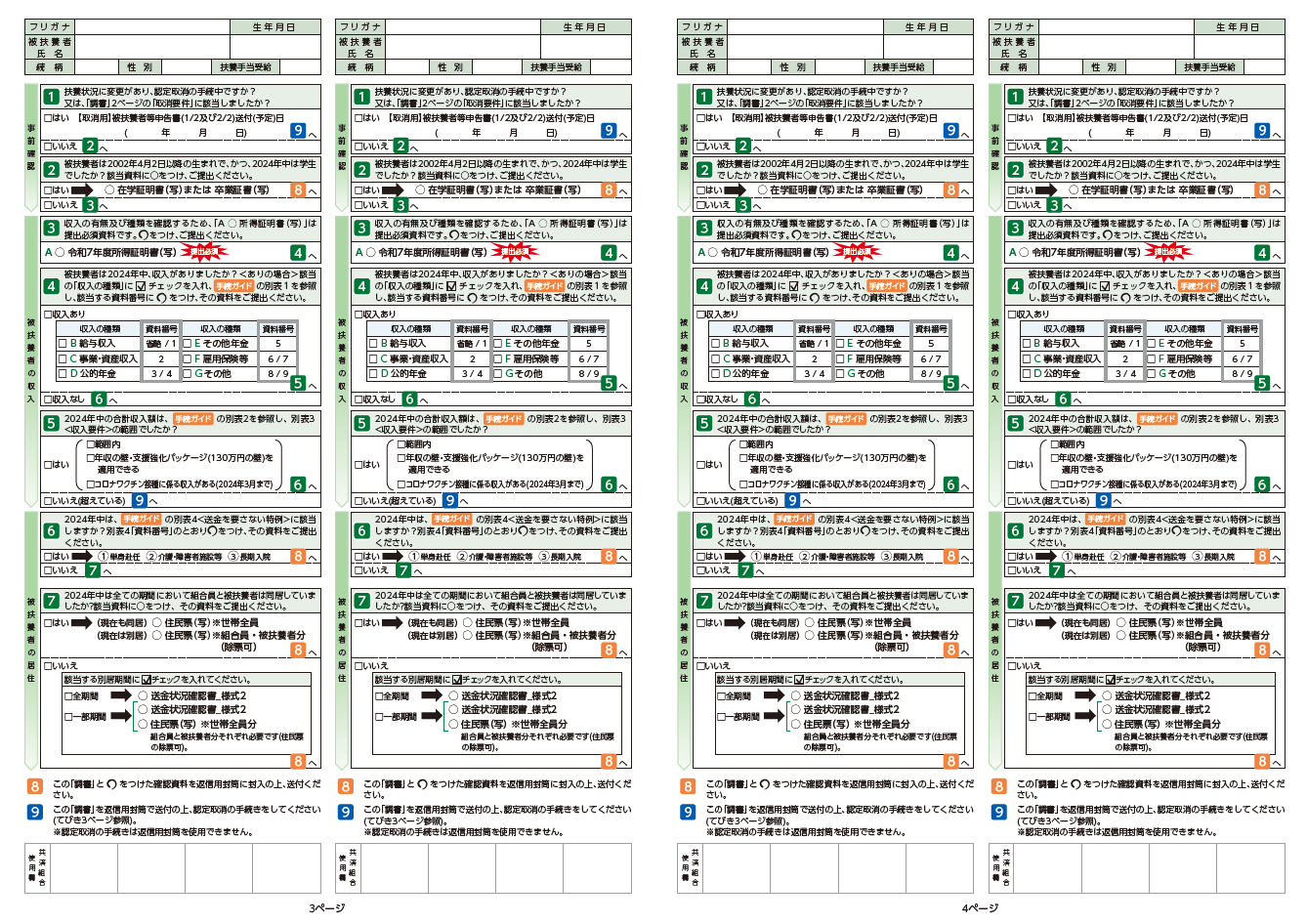 ⑧被扶養者の2024年中の収入をすべて合計し、手続ガイド 別表3 の「年収」範囲内であれば、□はい にチェックを入れ(☑)、右の選択項目も併せて該当するものにチェックを入れ(☑)てください。6 へ進みます。